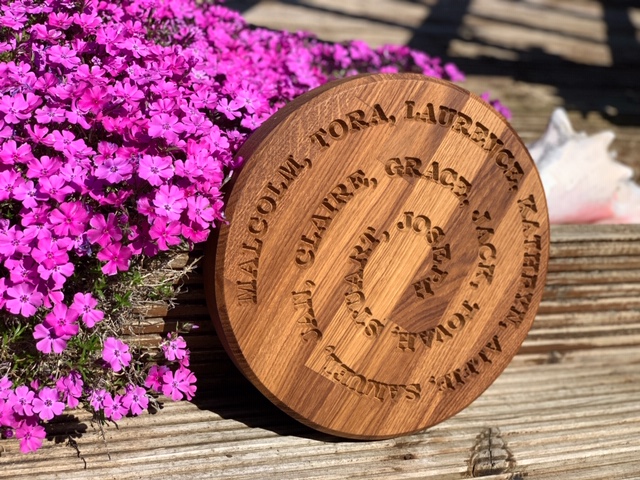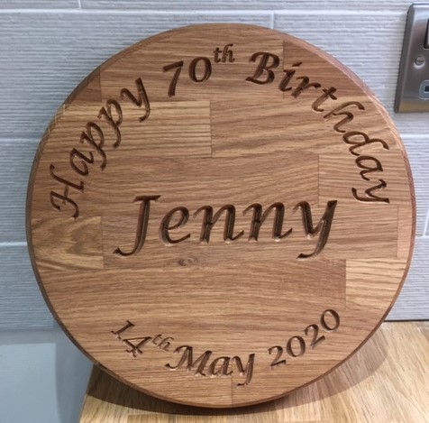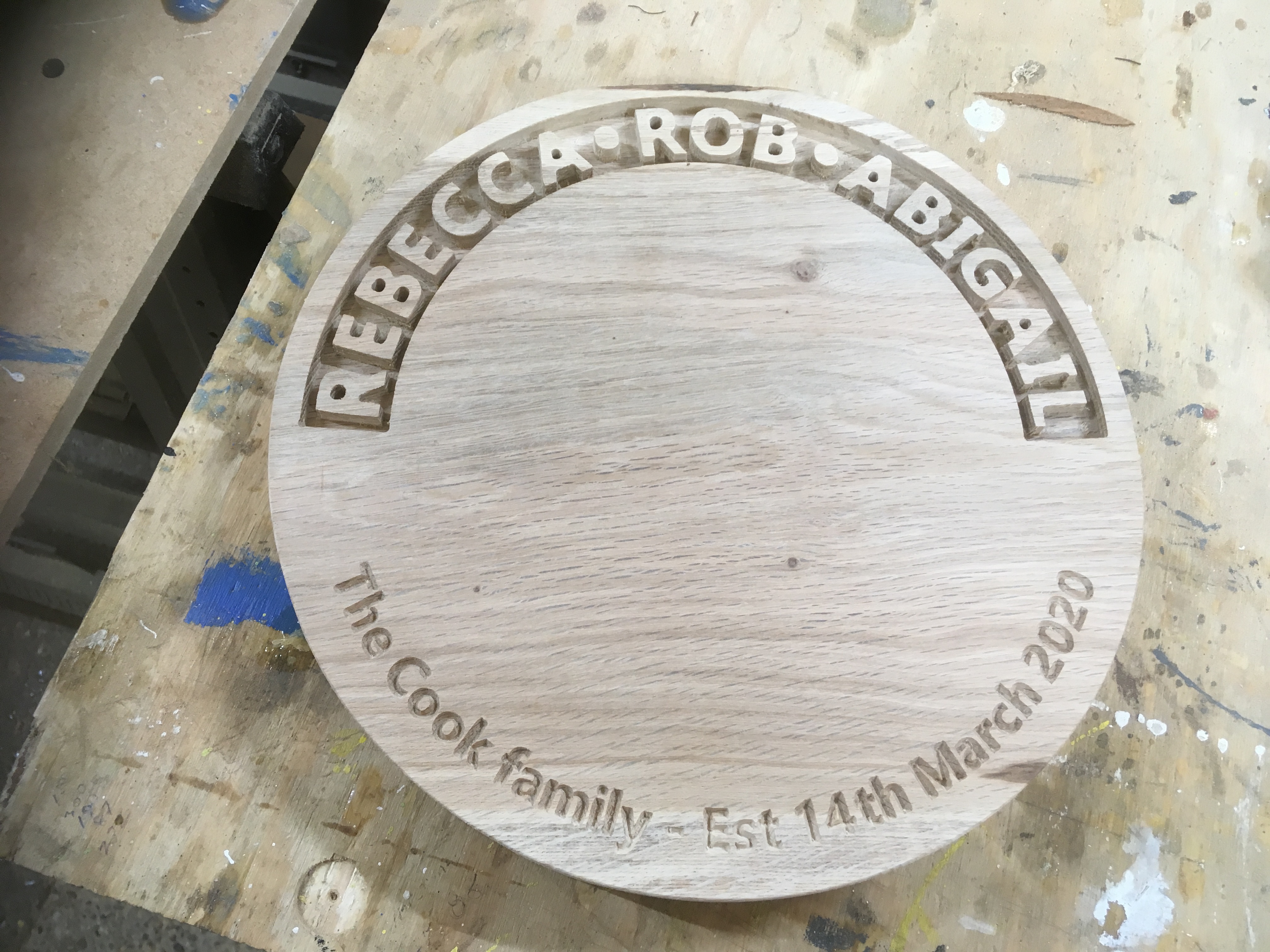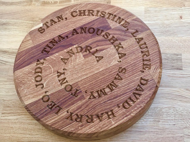 aprox. 30cm diameter oak chopping board with your family names or names of your choice engraved into the top surface. treated both sides with food safe mineral oils and chopping board compound so still a fully useable board should you wish, or just to have as a personal family gift.