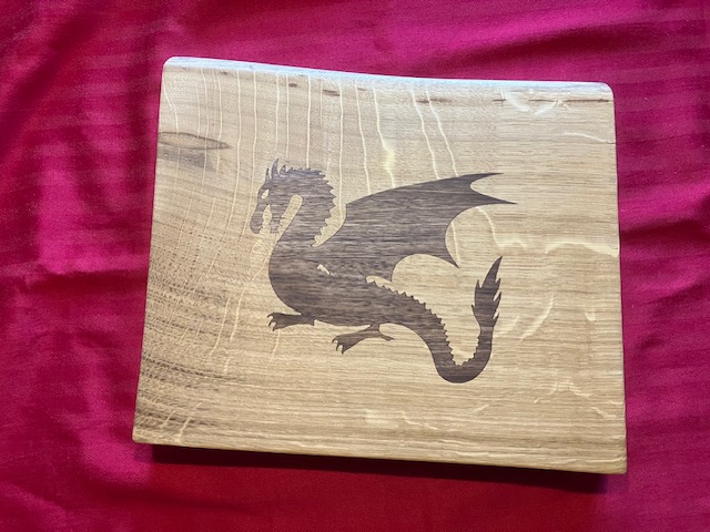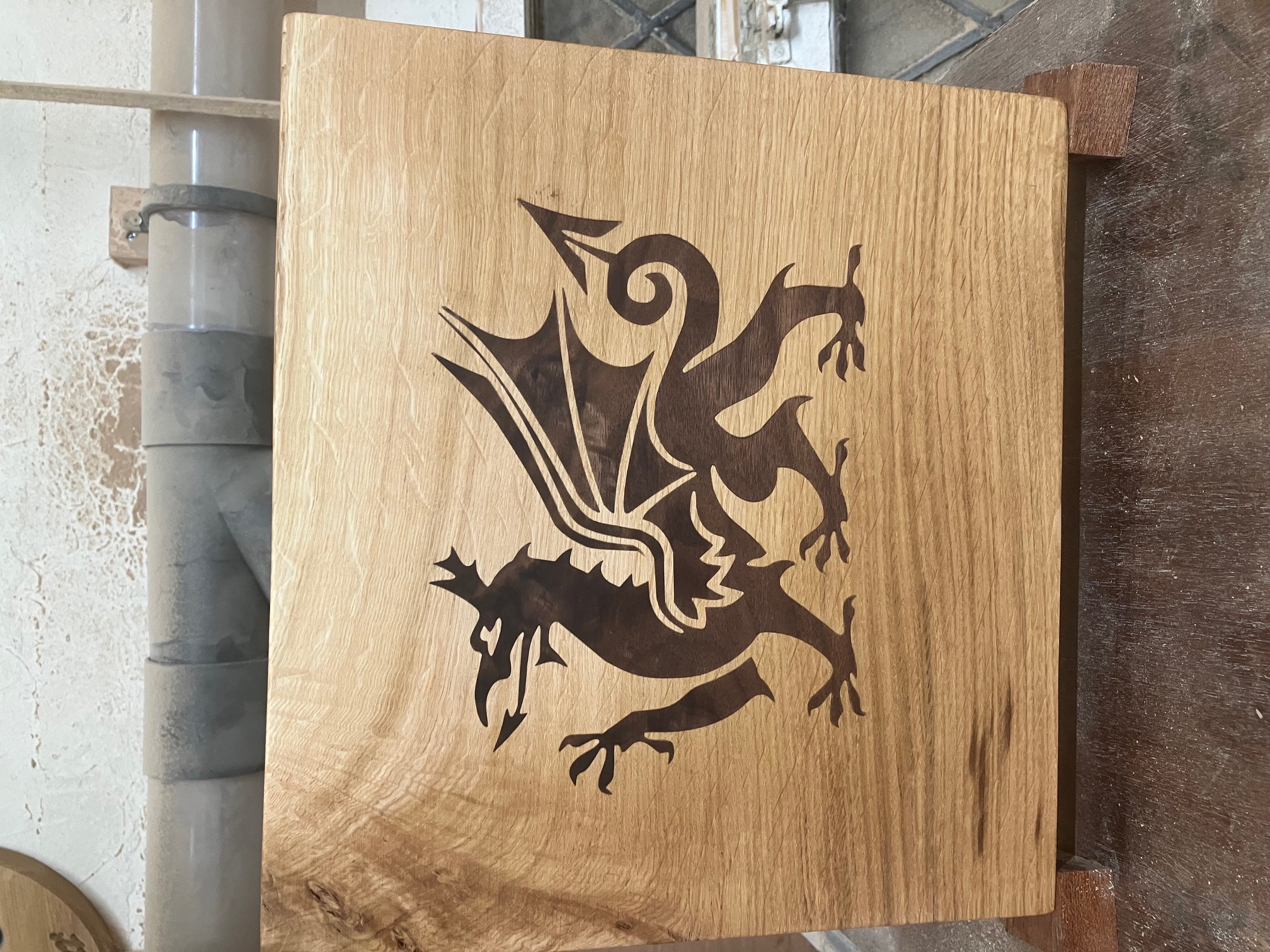 Solid oak natural edge board with English Dragon inlayed with walnut into the board