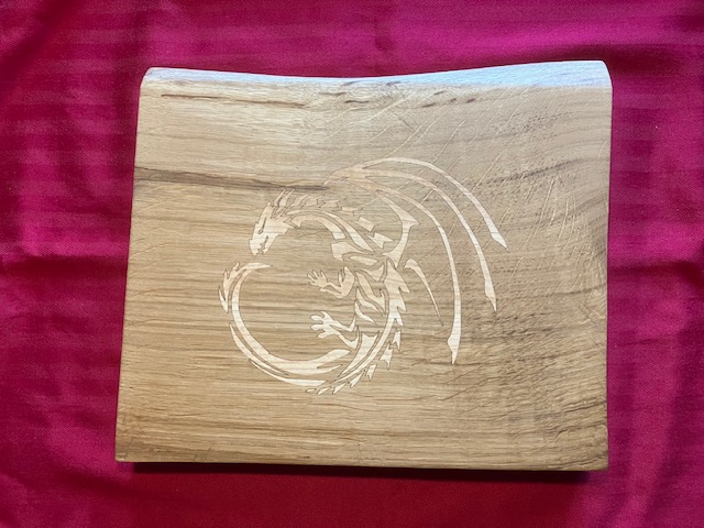 Chunky live edge oak board with maple inlayed Chinese dragon