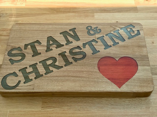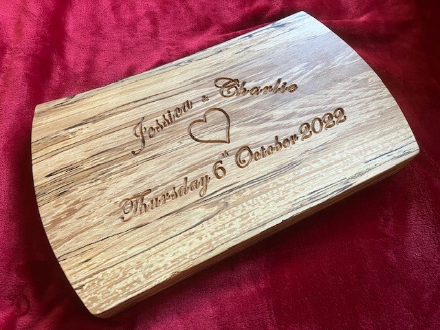 If you are looking for something different as a wedding gift here is another option for celebrating the big day, whether the happy couple are cooks or not, this can be used just to look at on display or the rear used as a chopping board as treated in exactly the same way as my more conventional boards, tretaed with food safe mineral oils and then a chopping board conditioner