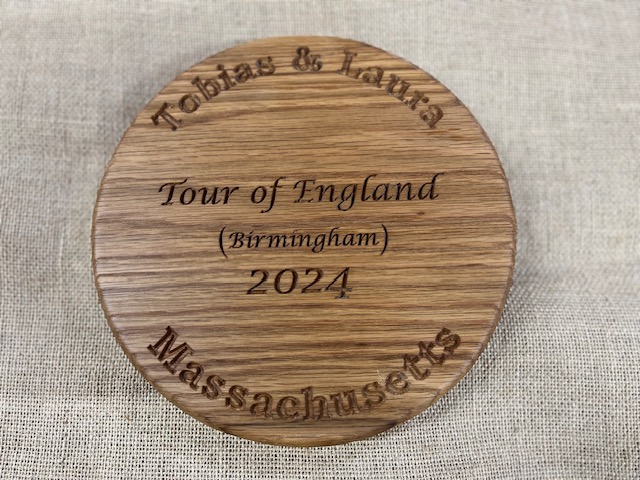 Small oak 8 inch diameter engraved board made for a couple visiting/working in the UK from the USA,