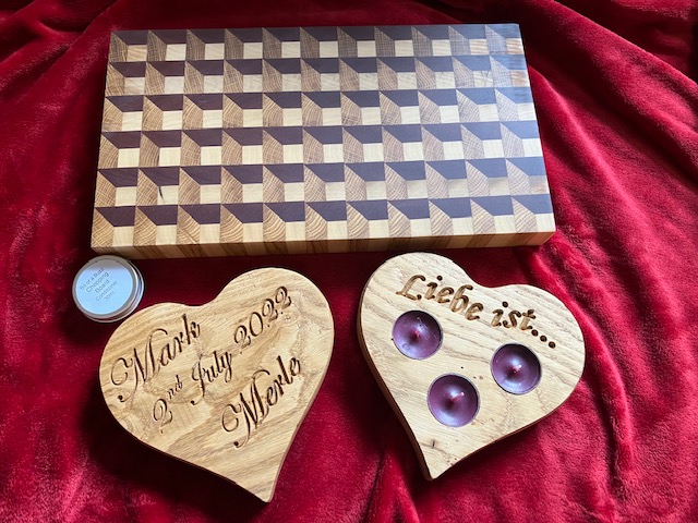 Wedding gift for a clients brother sent to Germany, 3D chopping board, personalised engraved oak heart, engraved oak heart tea light holder and a small tin of chopping board paste to keep it in good condition