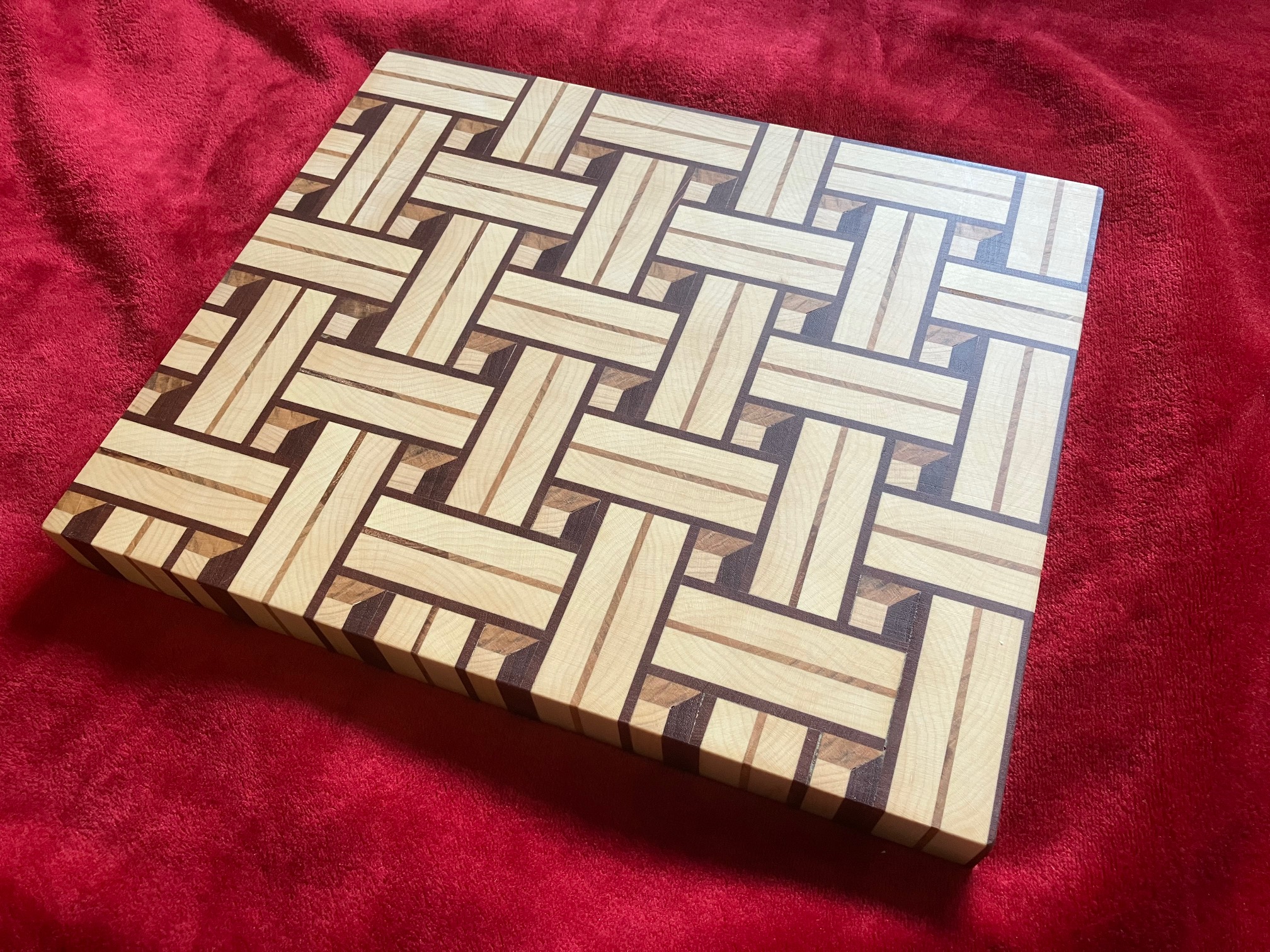 Weave design chopping board made from oak, maple and walnut aprox. 38 x 35 x 3.5 cm little bit bigger than my usual boards suit most modern and traditional kitchens.