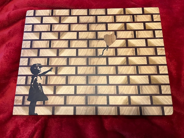 Banksy girl with balloon inspired graffiti board, made from poplar and sapele with an oak inlay balloon and walnut inlay for the girl, no resin, no paint, no laser burning just timber, aprox 39 x 30 x 3.8cm. you will probably spend more time looking at it than using it, stunning board