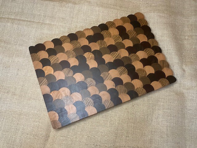 This is something special, and truly a one off board, tessellation patterned using oak, beech, walnut, wenge and sapele aprox 38 x 25 x 2.70cm. completely solid with 150 individual pieces of timber painstakingly cut and glued together to form this unique board.
