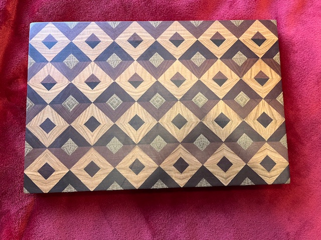 End grain diamond patten board aprox.38 x 25.5 x 3.5cm made from cherry, walnut and oak, treated with food safe mineral oil then finished with chopping board compound. great looking unusual patten board