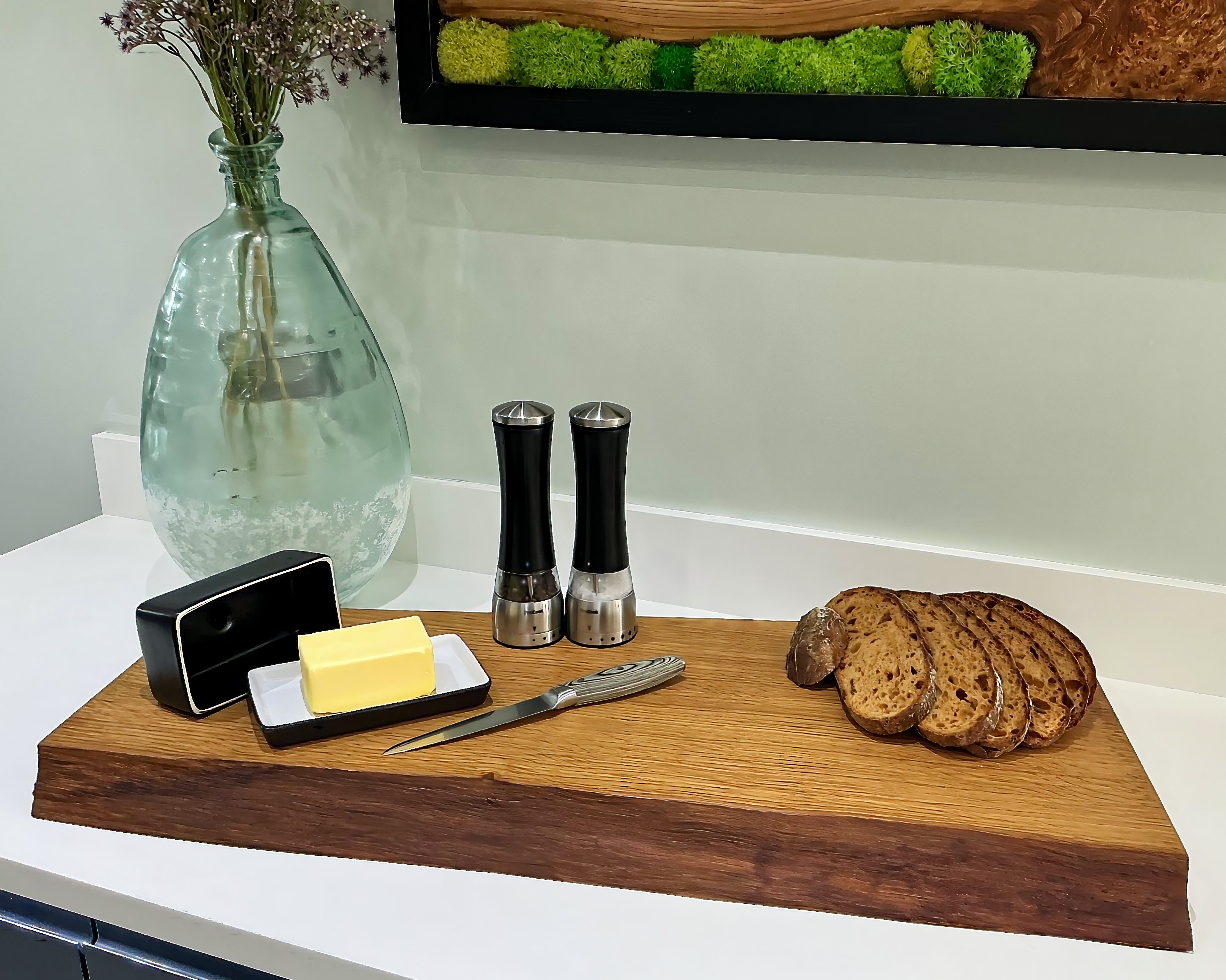 Double natural edge oak board aprox 38 x 28/20 x 3.5 cm board. One for the smaller kitchen, or the bar you built over lockdown for the G&T lemon and lime slices. As a small/medium size board this would make a great gift as not heavy, has some fantastic grain and colour to it