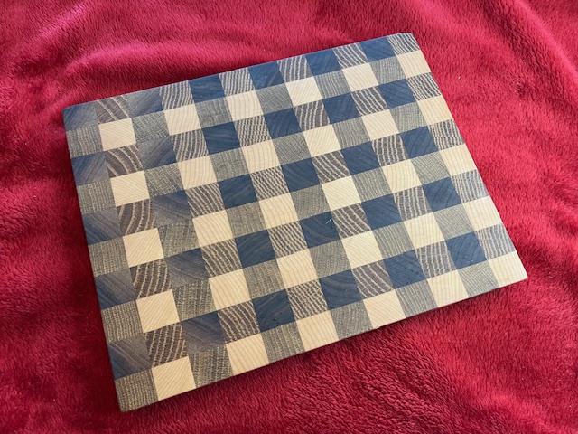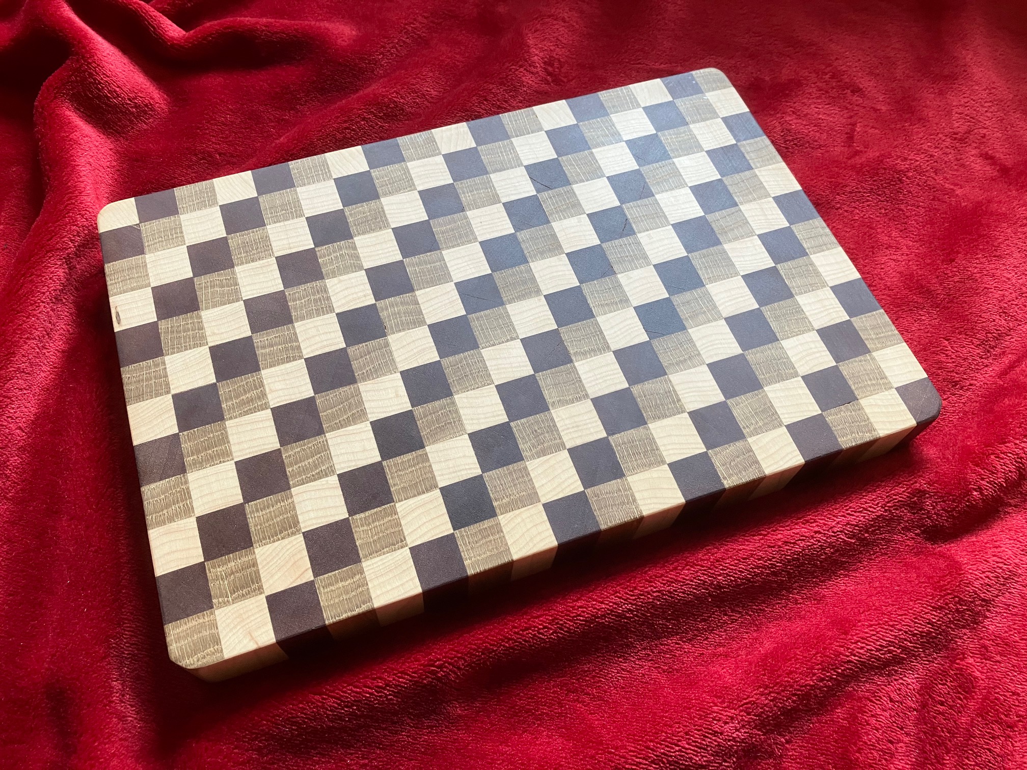 Small end grain chopping board in a plain plaid pattern aprox. 26 x 20 x 3 cm, made with oak, walnut and maple. being an end grain board they are less likely to warp or move.
